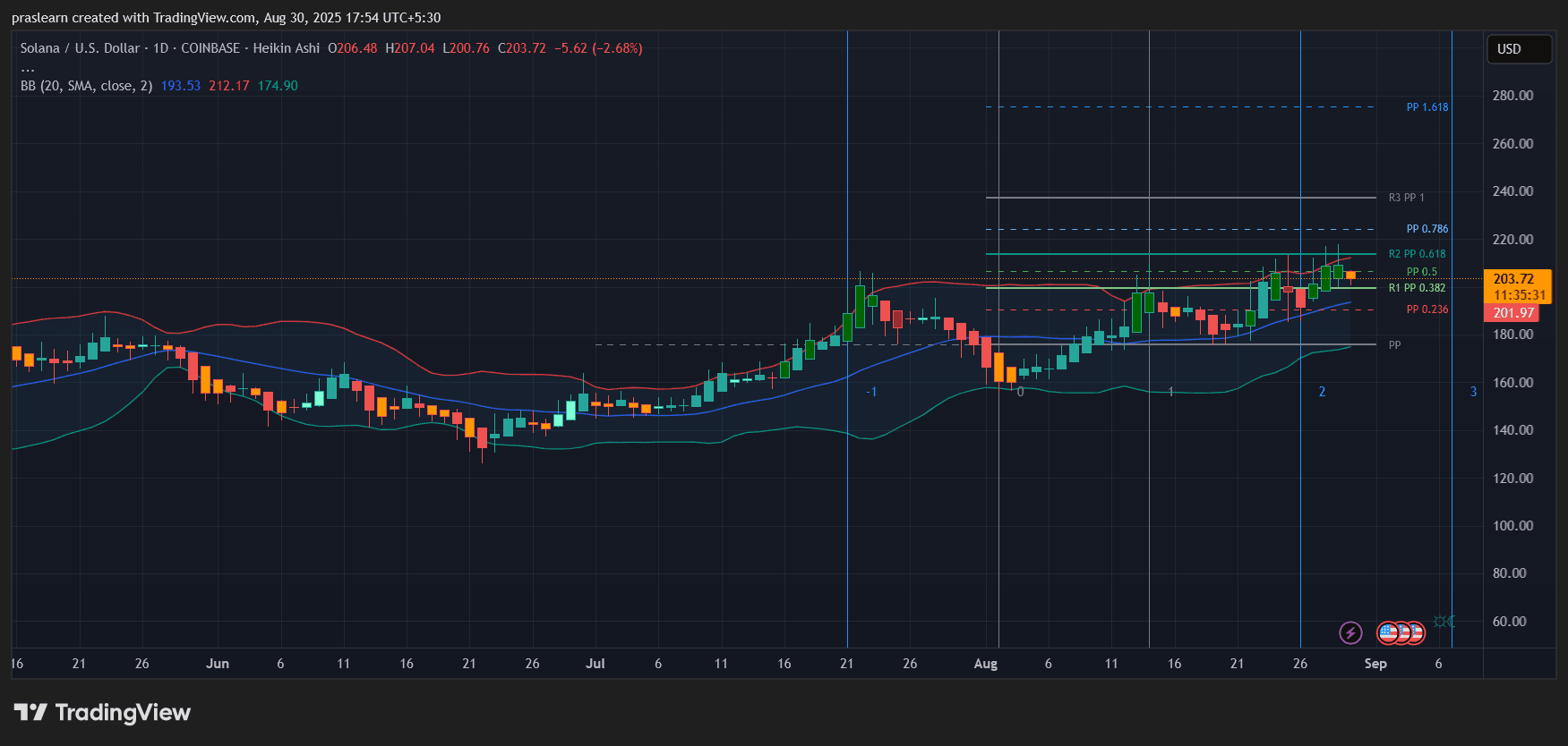 查看Solana价格日线图,SOL交易价格约为203美元,徘徊在上布林带和枢轴阻力簇标记的212美元阻力位下方。斐波那契回撤显示关键水平在198美元(支撑)和220美元(主要突破区)。自7月中旬以来,动能一直积极,SOL从160美元区域回升,但最近的蜡烛图显示在阻力位下方犹豫不决。