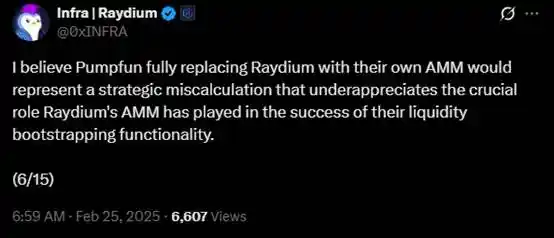 2 月 24 日,Twitter 上有人发现 pump.fun 正在测试自家的 AMM 流动性池。第二天,Raydium 核心贡献者 @0xINFRA 就发表了一篇长长的推文锐评此事。这篇长推文其实已经带着很浓的火药味,基本上就是在强调是 Raydium 在 pump.fun 的成功中起到了巨大作用、Raydium 在近段数据来看没有那么依赖 pump.fun 等。他最犀利的言辞是下图这段: