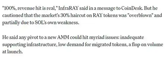 在回复 CoinDesk 时,@0xINFRA 持续表示对 Raydium 来说分手没那么糟糕,并表达他对 pump.fun 的担忧,「任何新的 AMM 都可能遇到无数问题:基础设施不完善、迁移代币需求低、交易量下降。」