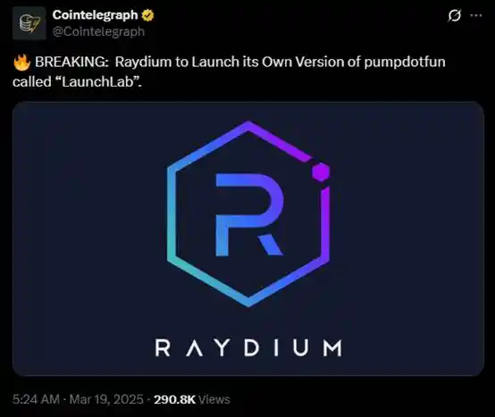3 月 21 日,pump.fun 正式官宣了 PumpSwap,从此 pump 出来的币不再有了内外盘之分。但在 PumpSwap 被官宣的 2 天前,3 月 19 日,Cointelegraph 就爆出,Raydium 即将推出自家的发射台,名为「LaunchLab」。