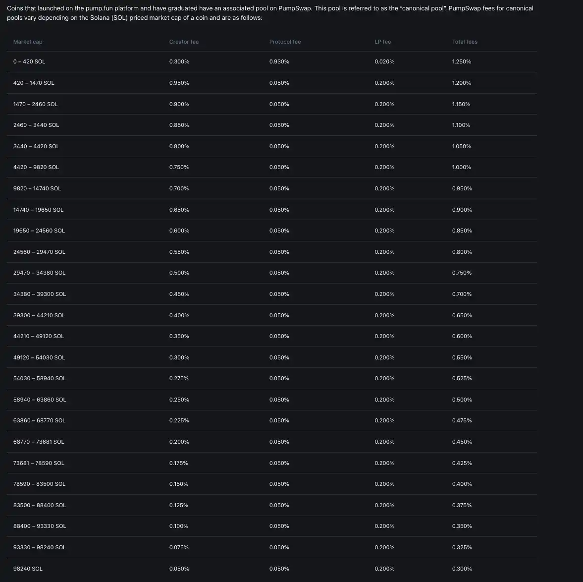 PumpSwap 不同市值代币对应的手续费和内容创作者收益
