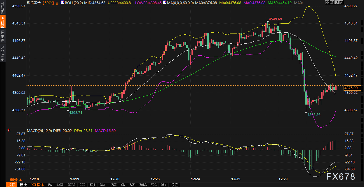 周二(12月30日),现货黄金市场于亚洲时段企稳反弹,价格一度触及每盎司4380美元,当前交投于4375美元附近,日内上涨约1%。这一走势是对前一个交易日历史性暴跌的技术性修复。周一,金价自纪录高点4549.71美元大幅回落逾4.5%,创下自10月21日以来的最大单日跌幅,最低探至4300美元关口附近。此次剧烈波动发生在年末交易清淡的背景下,流动性稀薄放大了价格波动幅度,但市场深层逻辑正在从纯粹的投机狂热,转向对长期结构性支撑的再确认。