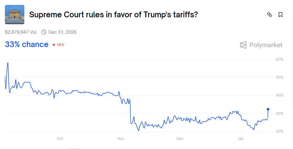 尽管最高法院在周三发布了三项意见,但其决定避免对关税挑战的裁决引发了投资者的猜测,认为法庭可能倾向于不推翻政府的贸易政策。在预测市场Polymarket上,自1月7日以来,法院支持特朗普的裁决几率增加了12个百分点,其中包括在今天的推迟后增加的6个百分点。