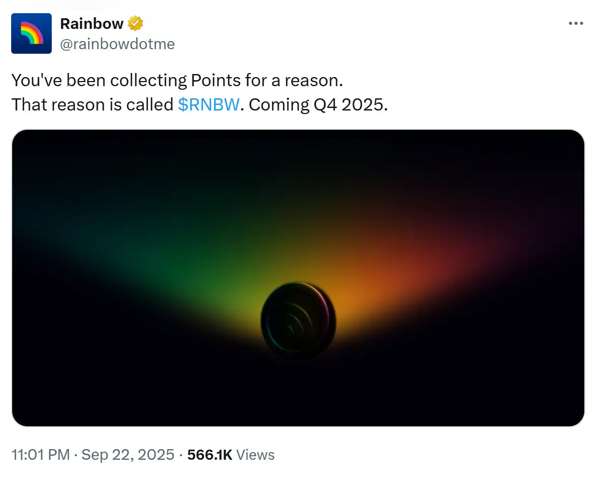 9 月 23 日,据官方消息,Web3 移动端钱包 Rainbow 宣布将于 Q4 发行代币 RNBW,具体空投和分配细节将由官方 Twitter 账号后续公布。